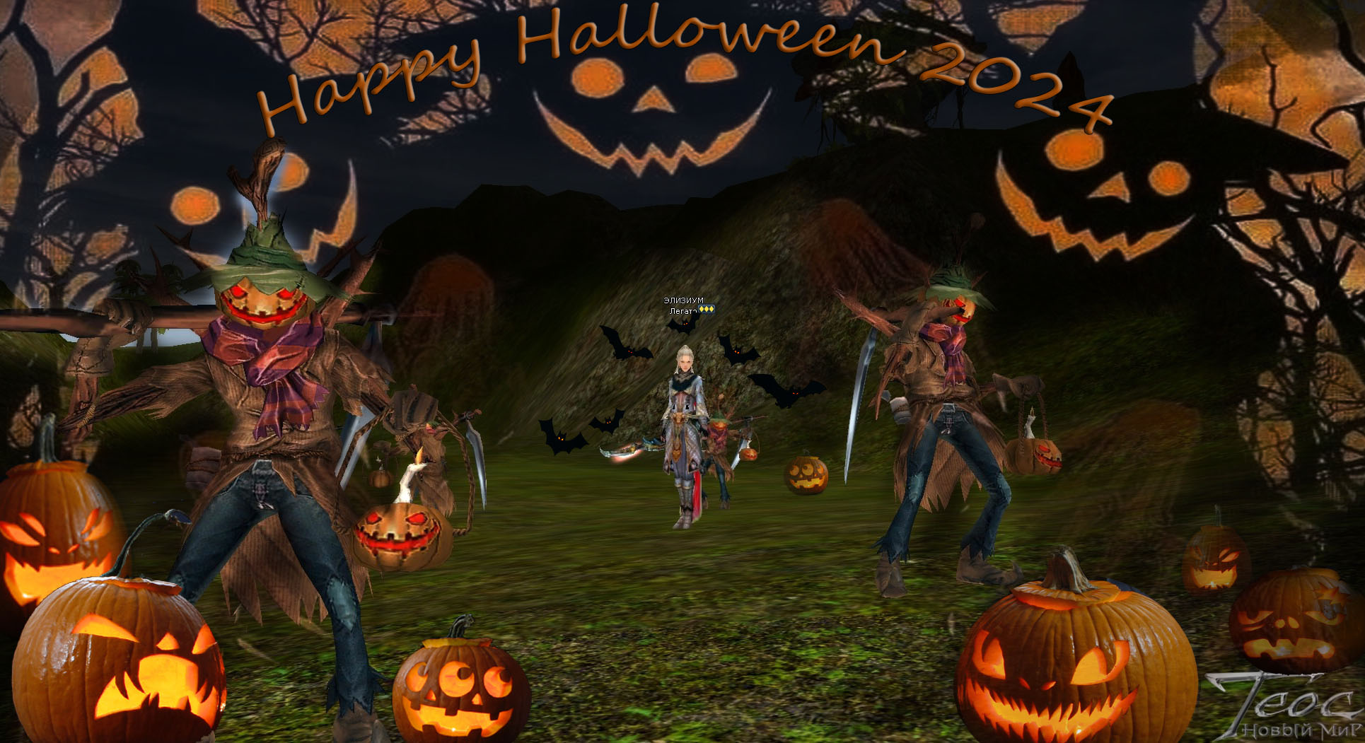 Воины и воительницы Нового Мира, во время битвы с противоположной фракцией, в схватке с жуткими монстрами или при встрече с Играющими тыквами и Тыквачами, сделайте оригинальный скриншот и оформите его в виде поздравительной открытки, украсив его праздничной хеллоуинской атрибутикой.